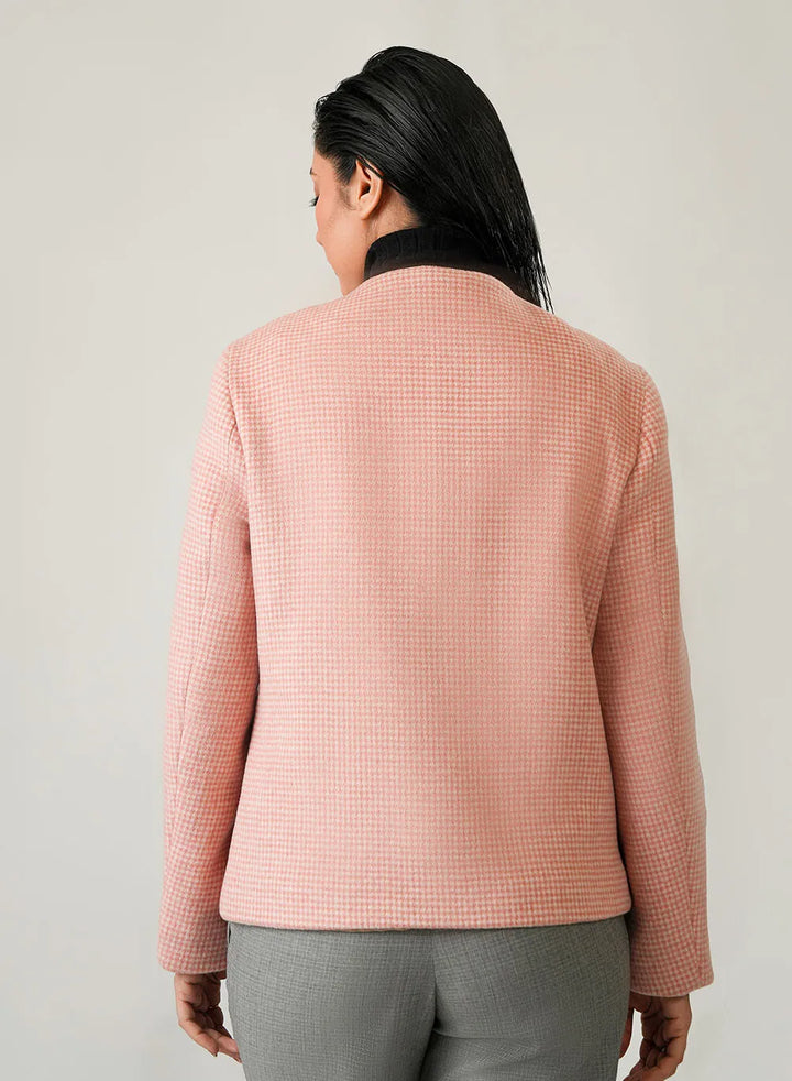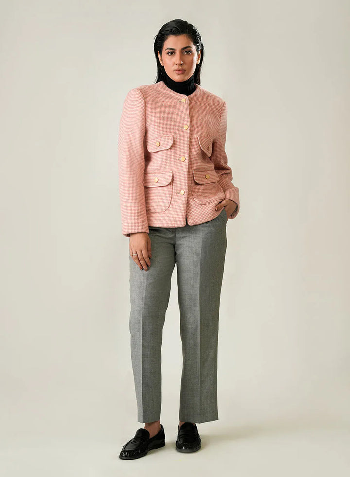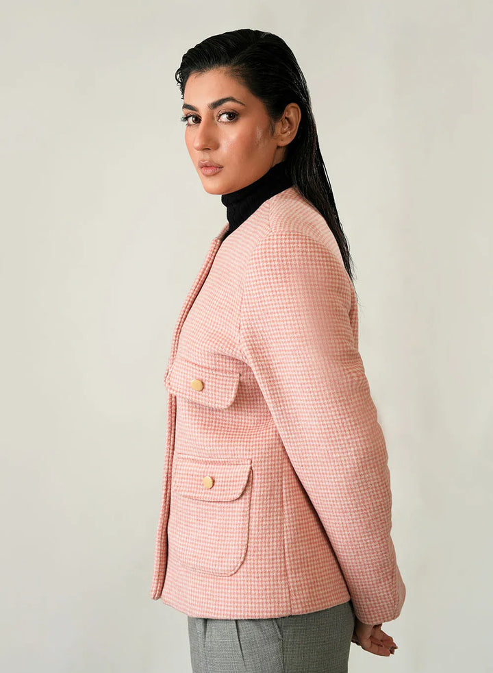 Stay cozy and stylish in this Ladies Jacket. It is made from soft Woolen Fleece material in a pretty Pink and White checkered pattern. Perfect for keeping you warm during the cold winter season