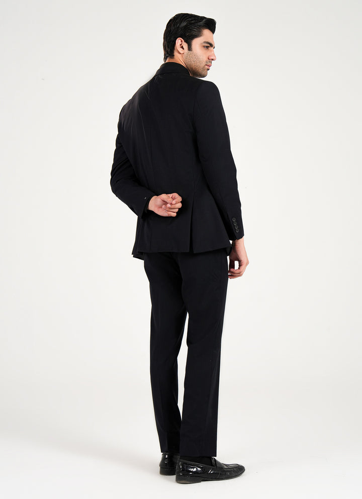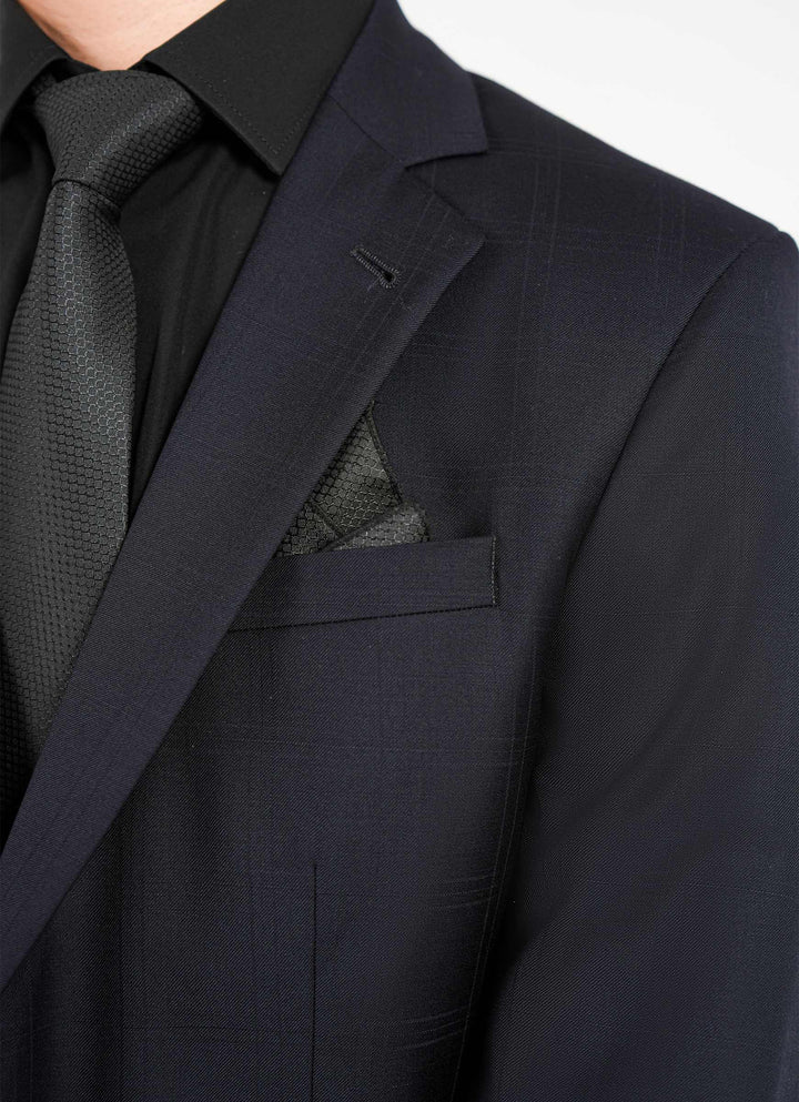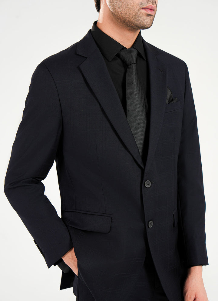 Stylish navy checked 2-piece suit. Premium Super 100’s fabric for a sharp, modern formal look.