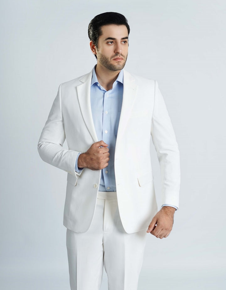 Stand out at summer weddings with this white wool-rich suit from the Tropical Classic collection. Designed for Pakistani men, this 2-piece suit features a regular fit and breathable wool fabric, making it ideal for warm weather. Perfect for weddings, Eid celebrations, and formal events.